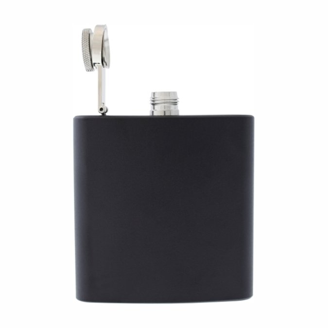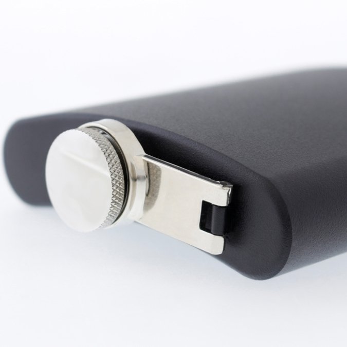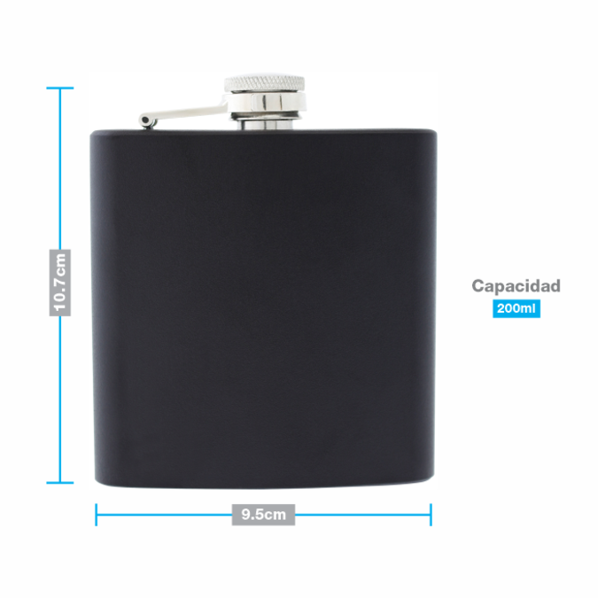 Licorera Rock Licorera de acero inoxidable de 200 ml. Acabado negro mate con textura tipo roca que permite grabados de mayor profundidad. Pequeña tapa con cierre de rosca. Se entrega en caja de cartón individual. Lavar antes de usar.