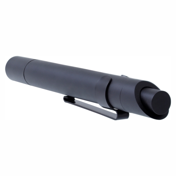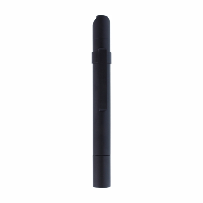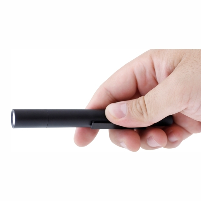 Linterna Lux Linterna de bolsillo color negro mate. Cuenta con clip para sujetarla al bolsillo, mismo que puede retirarse si así lo prefiere el usuario. Luz led de alta luminosidad. Mecanismo retráctil. Funciona con 2 baterías AAA (No incluidas).