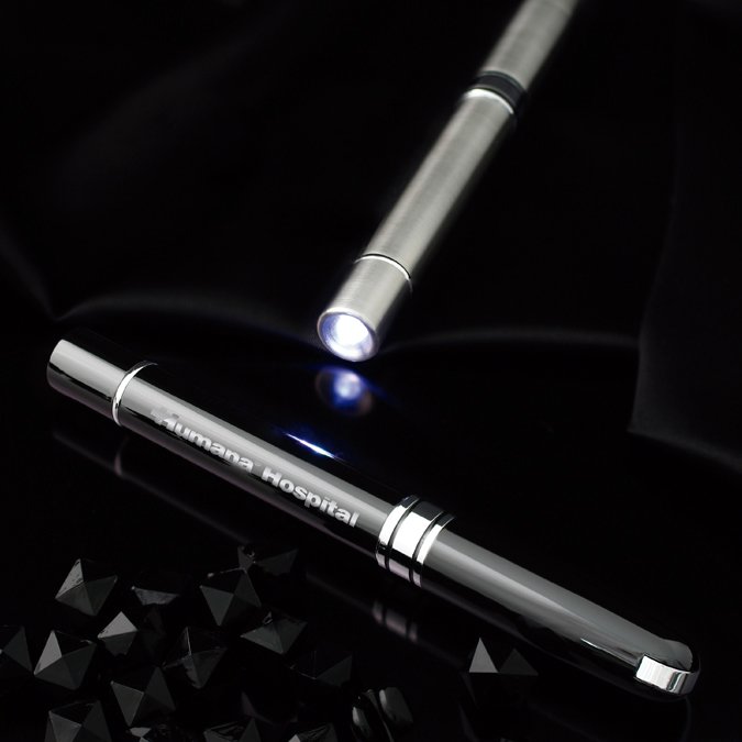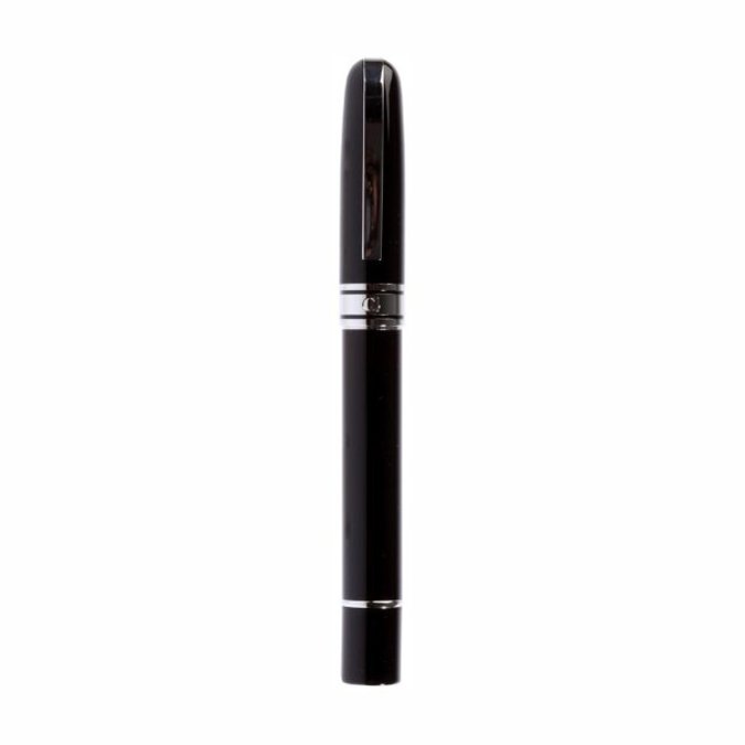 Linterna Sante Linterna metálica con apariencia de bolígrafo, ideal para colocarla en el bolsillo. Luz led. Disponible en color negro brillante, cromo y acero. Detalles cromados. Utiliza 2 baterías AAA (Incluidas). Incluye estuche individual.