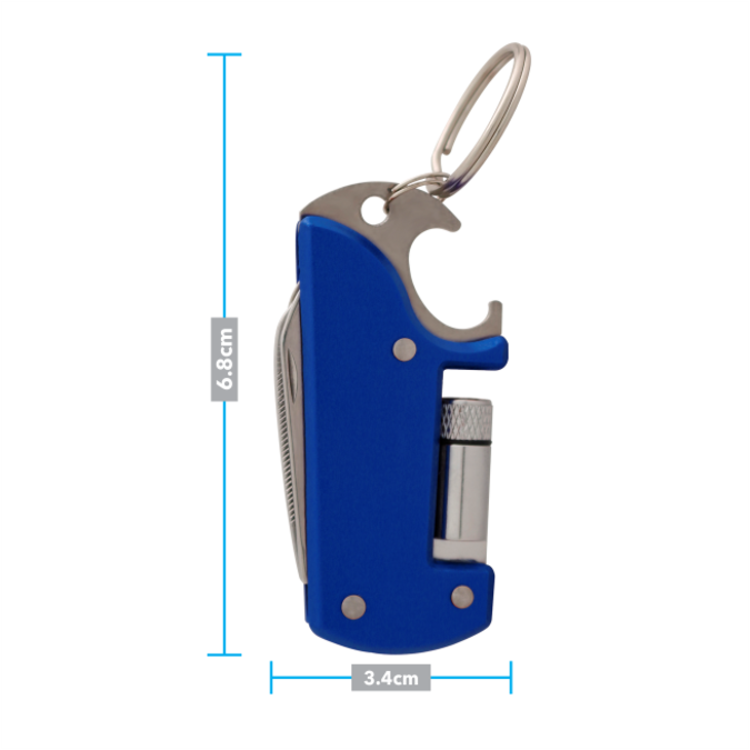 Llavero MF2 Multifuncional de bolsillo fabricado de acero inoxidable con terminados de aluminio. Llavero con destapador, linterna de luz led, lima de uñas y un par de navajas. Disponible en Azul, negro y rojo.
