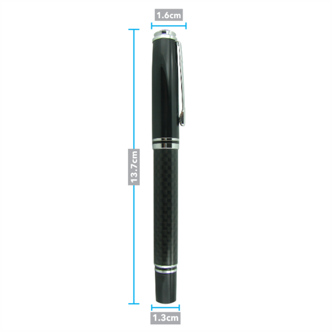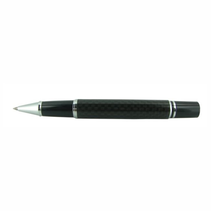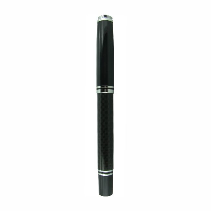 Suntory Bolígrafo metálico con tapón que cierra a presión. Acabado negro brillante. Detalles color cromo y cuerpo de fibra de carbono que le da ese singular diseño cuadriculado. Escritura de alto desempeño debido a su repuesto japonés tipo roller (a elegir entre tinta negra o azul). Incluye estuche individual.