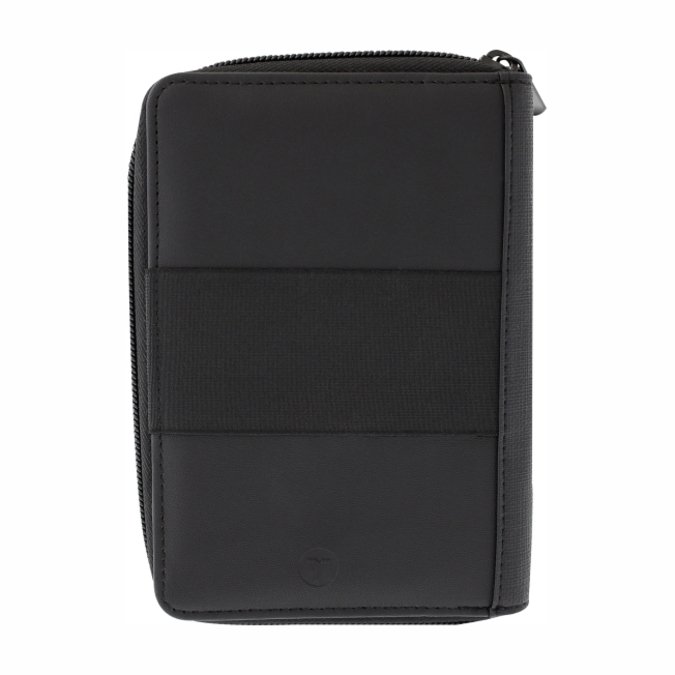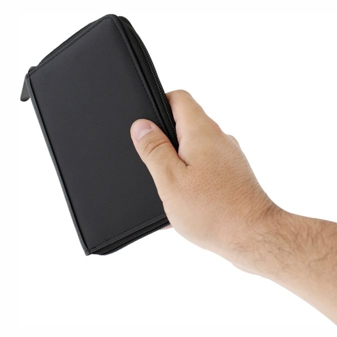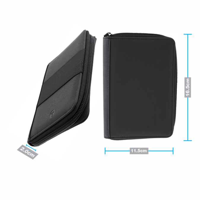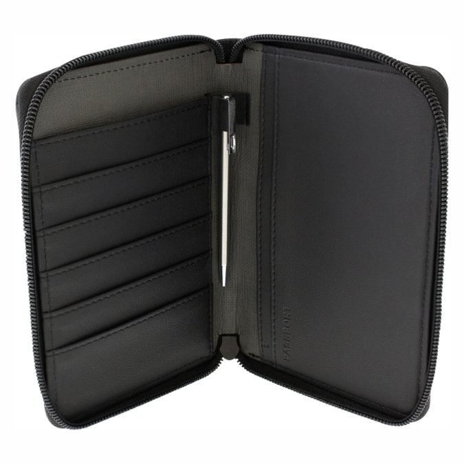 Porta Pasaporte Takayama Kuma Porta pasaporte con cierre, marca TAKAYAMA. Combinación de 2 texturas en curpiel color negro. Cuenta con espacio para 6 tarjetas, compartimento extra para efectivo. Incluye bolígrafo metálico color acero, tinta negra. Elástico exterior multi usos.