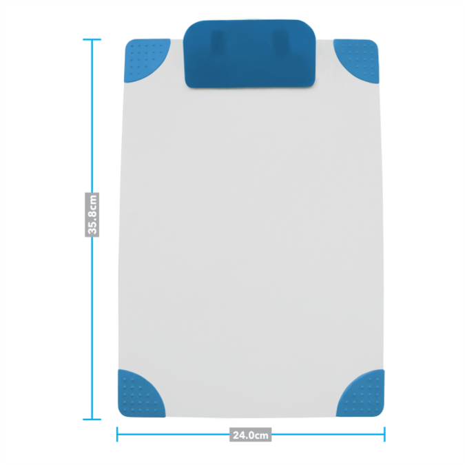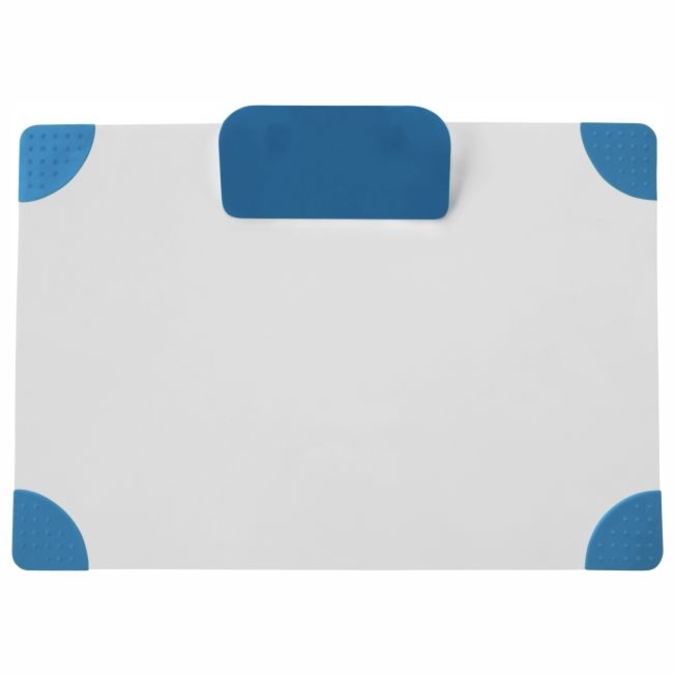 Tabla Quest Tabla de apoyo en plástico blanco con esquinas de goma y clip sujetador en diferentes colores. El clip se puede colocar en posición horizontal ó vertical a conveniencia del usuario.