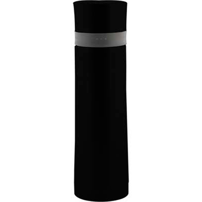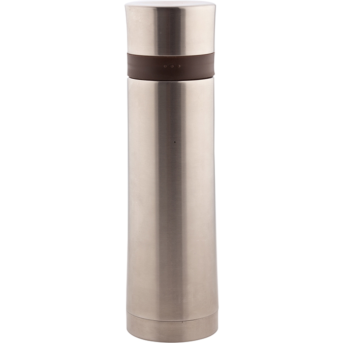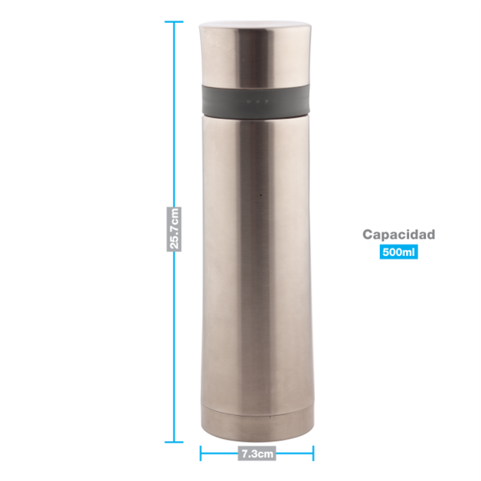 Termo Cosmo Elegante y funcional termo de acero inoxidable 500 ml. Tapa exterior con cierre de Rosca. Tapa interna con cierre de rosca y botón de seguridad para facilitar el uso del vaso sin necesidad de abrirlo por completo. Disponible en acero y en negro satinado. Se entrega en caja de cartón individual. Lavar antes de usar.