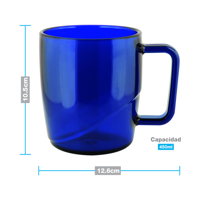 Taza Prego Prácticamente indestructible. Taza de policarbonato de 450 ml. Colores translúcidos. Hecha en México. Lavar antes de usar.